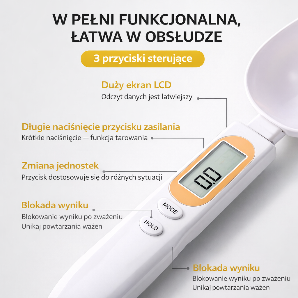 Masz dość zgadywania porcji? Ta cyfrowa łyżka z wagą daje Ci pełną kontrolę nad każdym gramem — szybko, wygodnie i bez brudzenia dodatkowych naczyń.